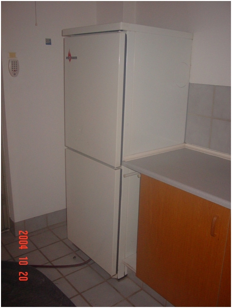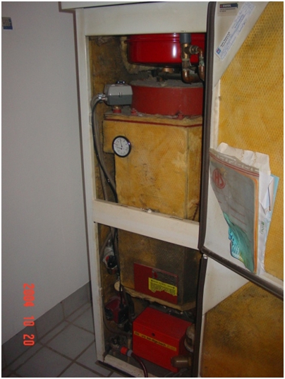 - Figur 6: Installation er færdig afdækning mellem kedel og varmtvandsbeholder er monteret, gas er ført ind til venstre for vvb, hul i skorsten er muret op