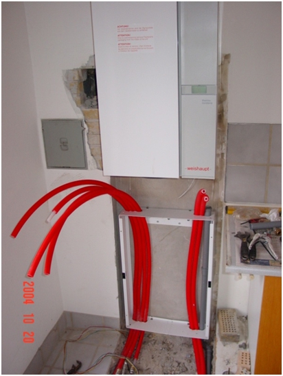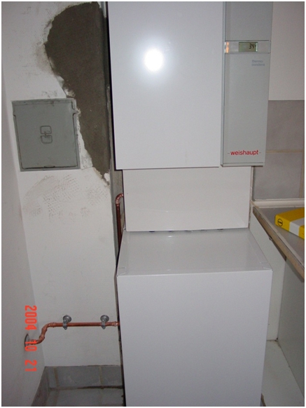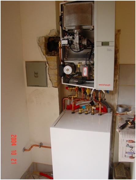 - Figur 4: Så er ny Weishaupt kedel opsat på væg rør er ført bag ved varmtvandsbeholders ramme